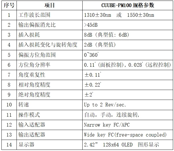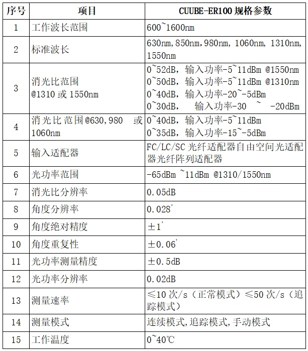 自動化偏振消光比測量系統(tǒng)包括一臺偏振優(yōu)化計(CUBE-PM100)和一臺消光比測試計(CUBE-ER100),兩者配合可自動調(diào)整和優(yōu)化線偏振光(PER>45dB)與被測器件保偏尾纖之間的對軸角度,進而實現(xiàn)PER的快速和高精度測量。